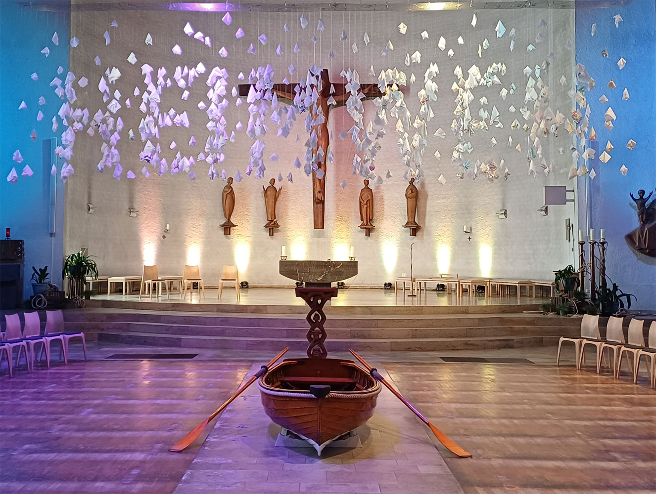 Beim Heimweh ist der Blick rückwärtsgewandt. Aber das Boot und die Segel laden ein, den Blick in die Zukunft zu richten. Das Taschentuch soll von einem Symbol der Trauer und des Abschieds zu einem Segel werden, das uns zu einer neuen Heimat bringt bzw. in uns eine neue Heimat entstehen lässt. Erstaunlicherweise weist die Bewegungsrichtung des Bootes nicht wie erwartet auf Jesus Christus, der an der Chorwand als Gekreuzigter dargestellt ist, sondern der Bug ist auf den Kirchenausgang ausgerichtet. Da Ruderboote quasi rückwärts gefahren werden, laufen Blick- und Bewegungsrichtung diametral entgegengesetzt. Der Ruderer blickt also durch das Heimweh hindurch auf Jesus Christus und damit auf Gott, den er wie einen Kompass richtungsgebend im Blick hat, während er rücklings neuen Zielen entgegenrudert.