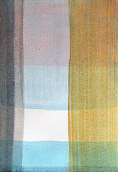 Vertikale Farbbahnen überlagern im rechten Winkel und goldenen Schnitt die horizontalen Farbflächen der ersten Farbschicht. Dunkelgrau wäßerig links, ockerfarben golden rechts, verdecken sie wie ein halb zurückgezogener Vorhang das Dahinterliegende. Gleichzeitig geben sie den Blick frei – und verstärken ihn noch – auf die asymmetrisch leicht verschobene Mitte mit ihren klaren lichtdurchdrungenen Farben.
