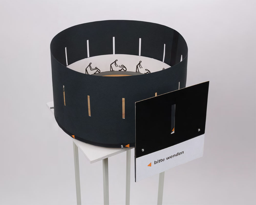 In einer sogenannten Wundertrommel befinden sich auf einem Papierstreifen vierzehn Einzelbilder. Versetzt man die Trommel in der angegebenen Richtung in Schwung und schaut durch die Schlitze, dann reihen sich die Bilder zu einem kurzen Film aneinander. Zu sehen sind zwei Personen in Bewegung, wobei die linke Person auf die am Boden kauernde zugeht und dieser hilft aufzustehen. Solange die Trommel im Kreis gedreht wird, wiederholt sich das immer und immer wieder (Film abspielen).